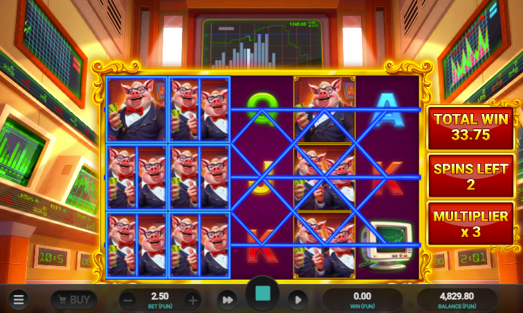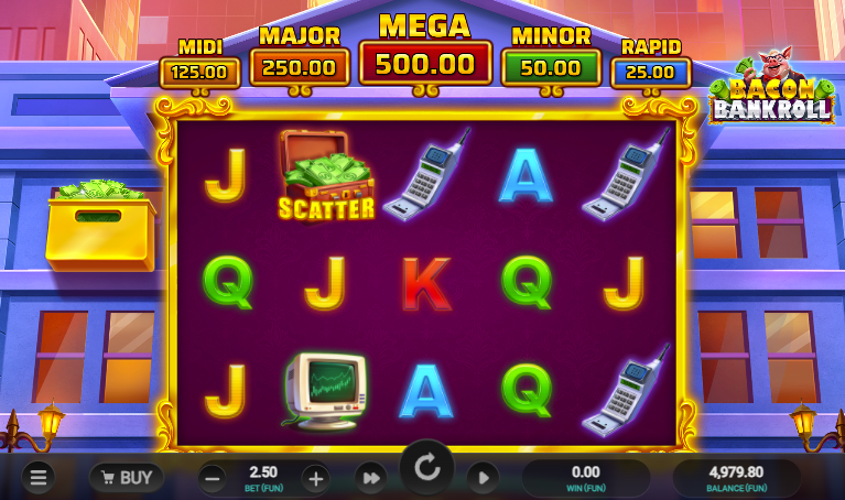Bacon Bankroll brings a playful twist to Wall Street, featuring a piggy banker in a sharp suit, surrounded by cash, computers, and skyscrapers. The reels are set against a backdrop of a New York bank, with symbols like green and orange pigs, phones, and computers. The game offers a fun and engaging experience, with bright visuals and smooth animations that enhance the gameplay. The jazzy soundtrack complements the theme, keeping the atmosphere lively as you spin the reels.