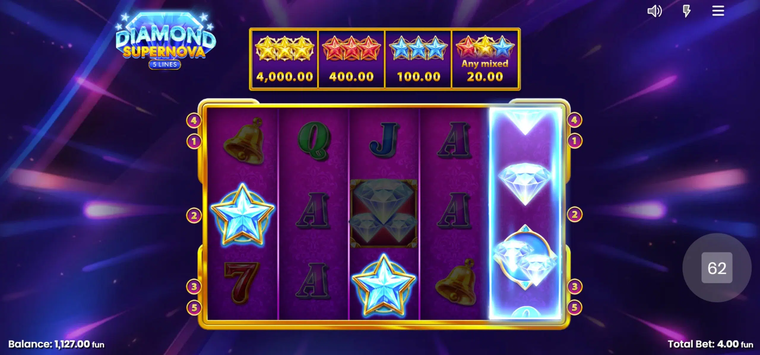 Diamond Supernova comes with a 5-reel, 3-row layout. Depending on the version you pick, you get 5, 20, 40 or 100 fixed paylines. Bets start around 0.10 and go up to 100 per spin. The quoted RTP in its “best” variant is about 96.33%; though some casinos may offer lower-RTP versions (94.29% or even 85%). Volatility is low, meaning wins tend to come more often but are generally modest rather than explosive. The top payout, the “max win” sits around 1,000x your bet.