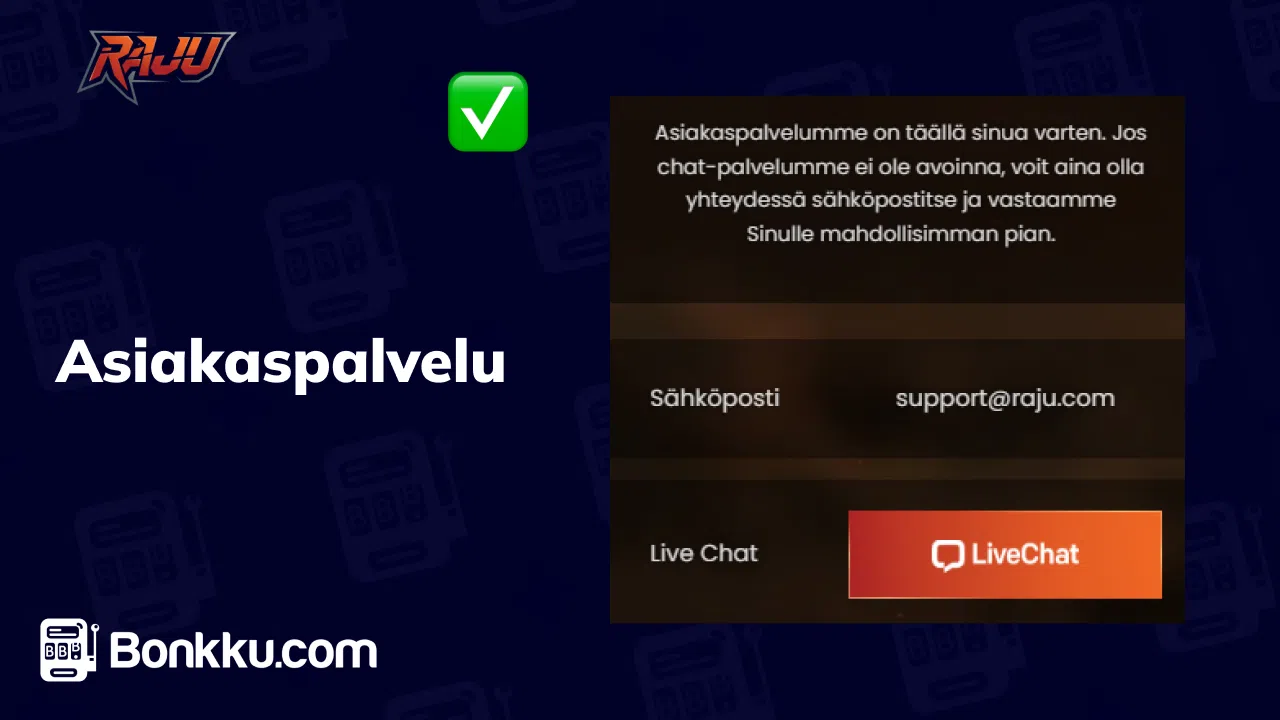 Raju Casinon asiakaspalvelu on asiallista ja helposti tavoitettavissa, vaikka live chat ei olekaan auki 24/7.