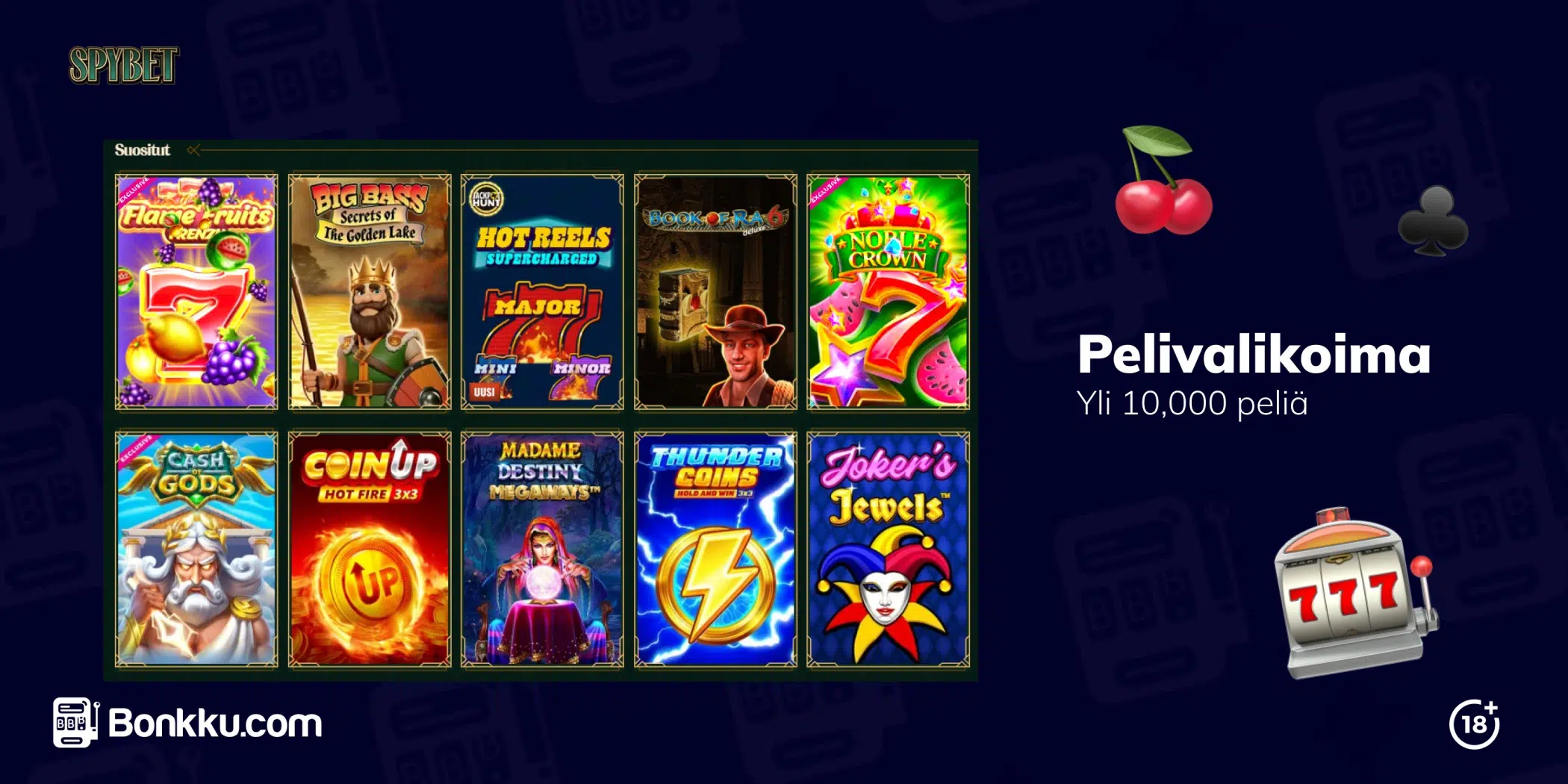 Spybet Casinolla on yli 10,000 peliä, ja peliaula on suunniteltu selkeäksi ja helppokäyttöiseksi. Pelejä voi selata kategorioiden tai pelinvalmistajien mukaan – suodattimet auttavat löytämään suosikit nopeasti.